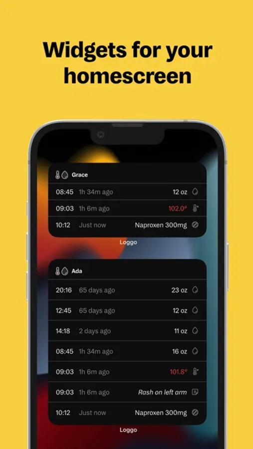 Get reminded via push notifications after desired amount of time or keep track of your logged fever, water, medicine & symptoms via the beautifully designed widgets for your home screen.