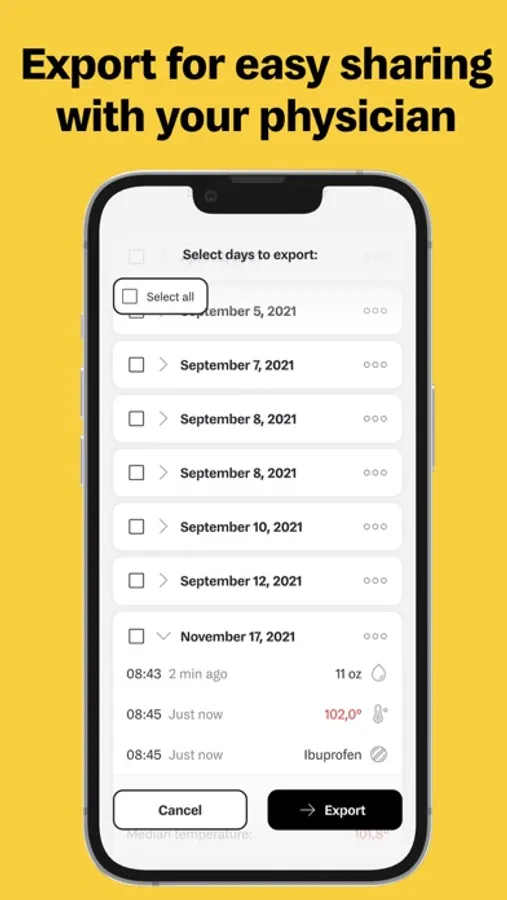 You can easily switch between different people in your household and export data to a file for emails or SMS/textting.