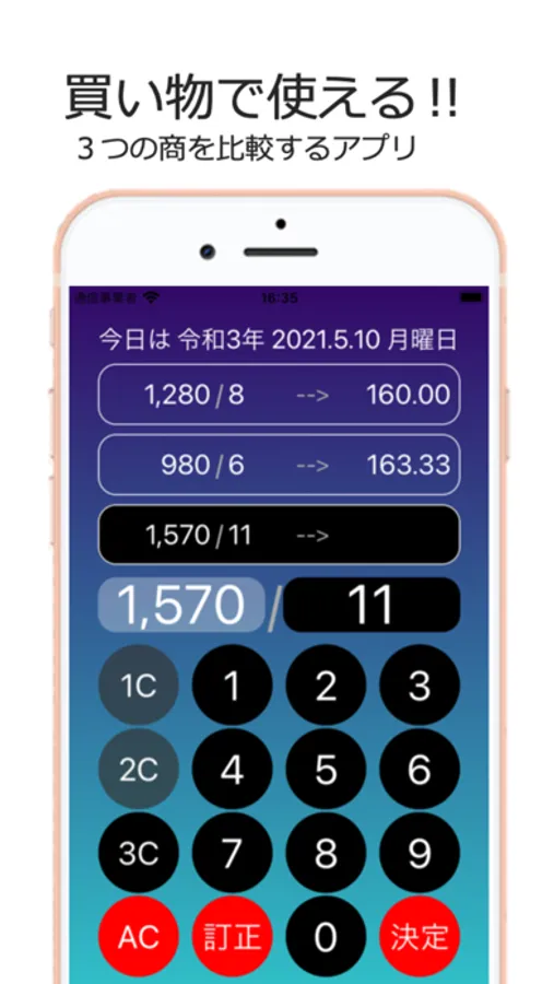 単価を調べる時に便利。わり算の式と答えが3つまで残ります。買い物をする時、1グラムあたりの値段、1本あたりの値段を出すときなど、役に立ちます。割り算専用電卓です。