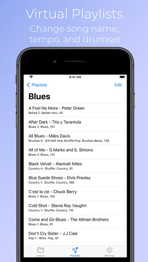 Playlists contain virtual songs that link to existing songs but with their own name, drumset, and tempo.