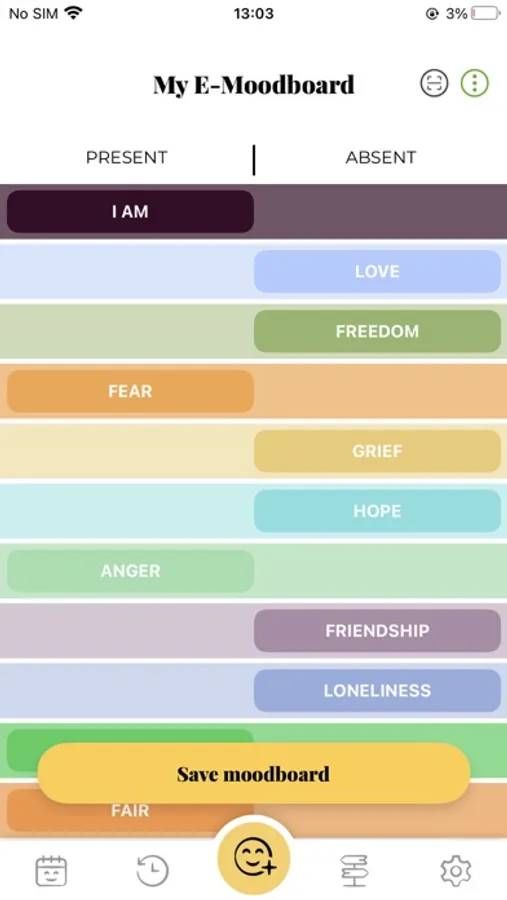 E-Moodboard can help to understand your emotions and feelings by asking yourself the question: What emotions am I feeling today? You can determine the answer in the moodboard by shifting the 40 signs that represent emotions, feelings and thoughts.