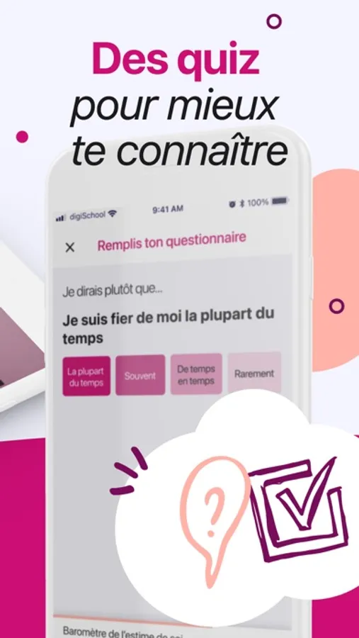 - Répondre à des questionnaires, inviter ta communauté de confiance et comprendre comment les autres te voient. Tu vas accéder aux bilans qui t'aideront à mieux te connaître et valoriser qui tu es.