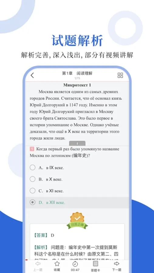 专为大学俄语六级考试精心准备的考试配套题库,每一道试题都有答案解析,为考试提供了充分的复习准备,可随时随地学习练习,支持手机、平板多端同时使用。