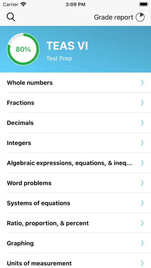 We offer a complete test prep course for the TEAS Math test. Every lesson features video instruction, guided practice, tests, background modules, diagnostic quizzes, and more. Track your progress with our dynamic grade report and use the chapter reviews and final exam to solidify your knowledge.