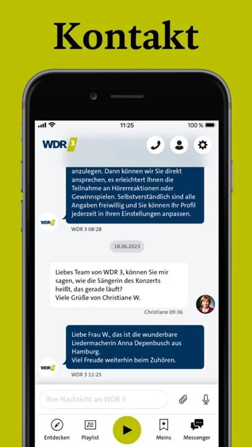 Wenn Sie uns Anregungen, Lob oder Kritik mitteilen möchten, freuen wir uns über Ihr Feedback an wdr3app@wdr.de oder über die Messenger-Funktion der App.