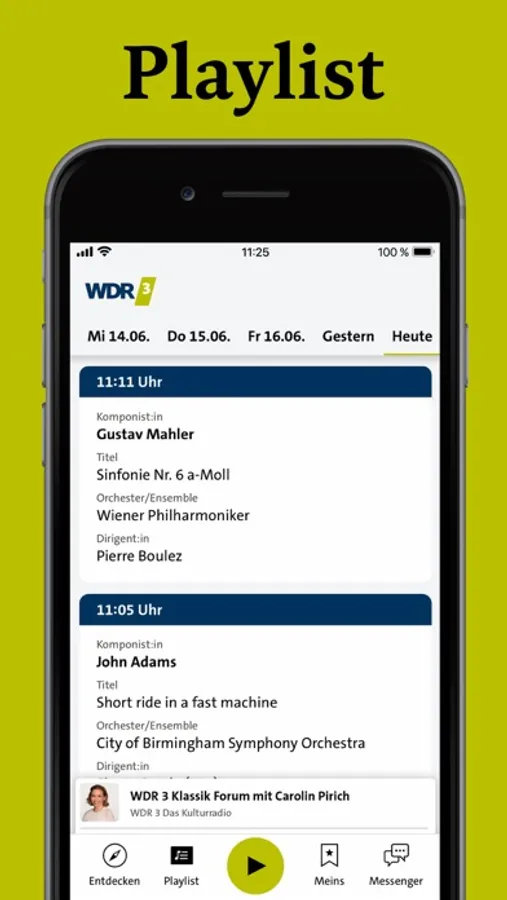 In der Playlist können Sie nachsehen, was gerade läuft und welche Musiken heute, gestern und in den vergangenen 7 Tagen gespielt wurden.