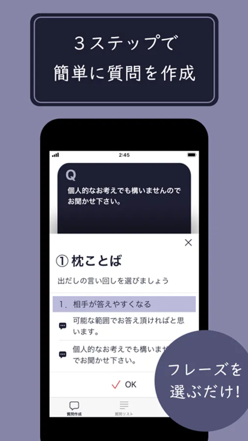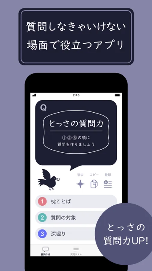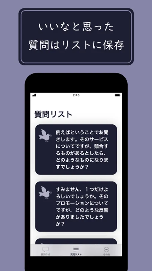 このアプリがあれば、説明会やプレゼンの後「何か質問はありませんか?」と振られても困ることはありません。あなたの質問力を向上させ、積極的に質問することが楽しくなる、そんなアプリを目指しましたので是非ご活用頂ければ幸いです。