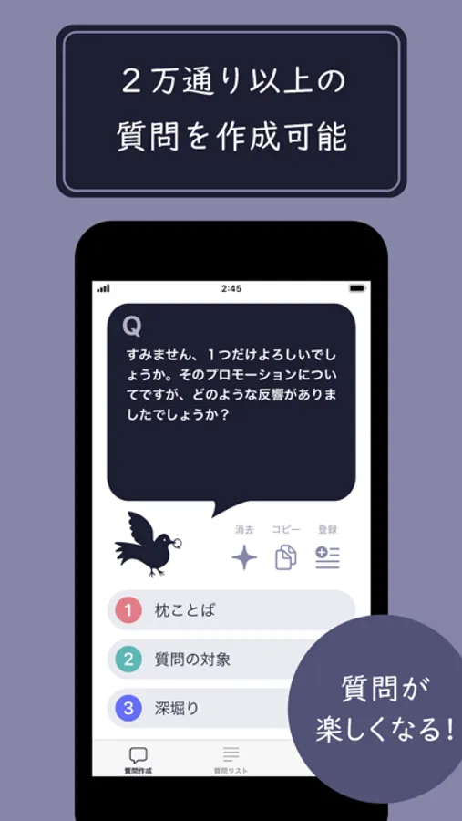 「枕ことば」「質問の対象」「深堀り」に該当する様々なフレーズを組み合わせ、2万通り以上の質問を作成可能です。