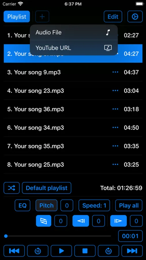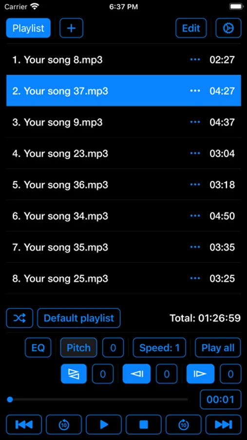 - Play different audio formats: ".mp3", ".m4a", ".flac", ".wav", ".aac", ".ac3", ".aiff", ".au", ".caf", ".mp2"