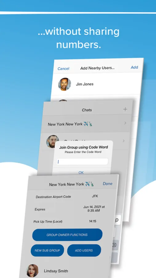 No data or location service? No problem! Start a group or join a group with a codeword, it’ll automatically add you in next time you connect to WiFi.