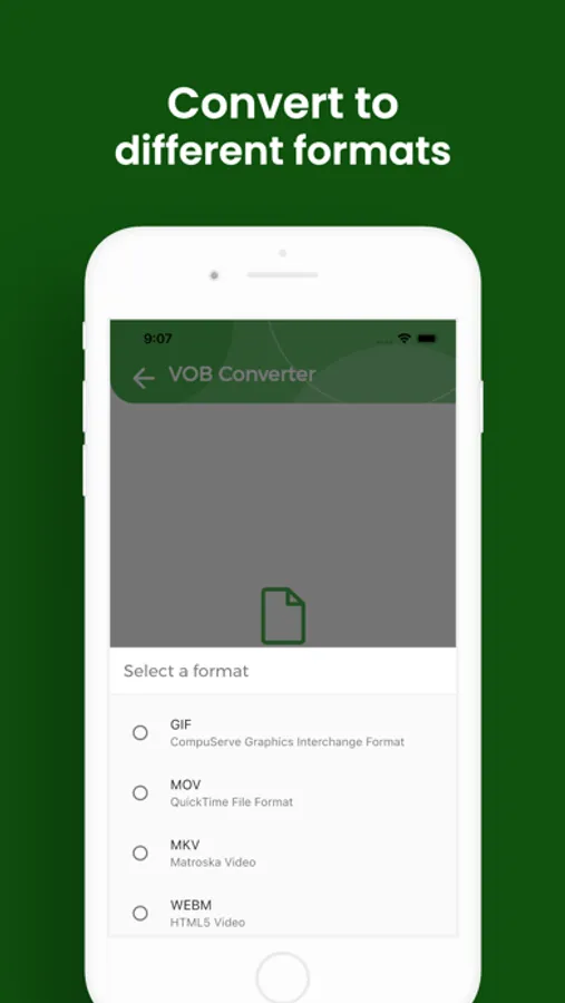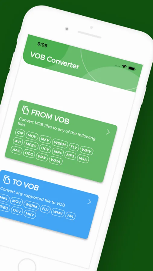 This conversion application allows you to convert any VOB video file to other files like GIF, MOV, MKV, WEBM, FLV, WMV, AVI, MPEG, OGV and MP4, it can also convert other files to VOB.