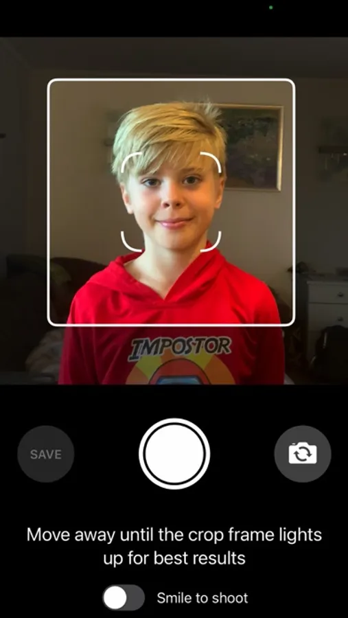 If your arms aren't long enough, enable the "smile to shoot" option, move away and smile when you are satisfied.
