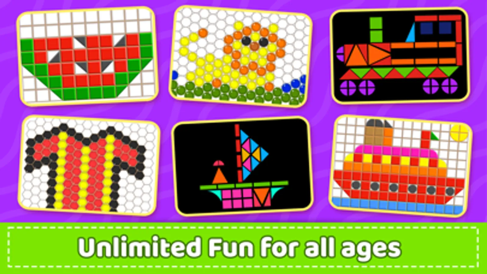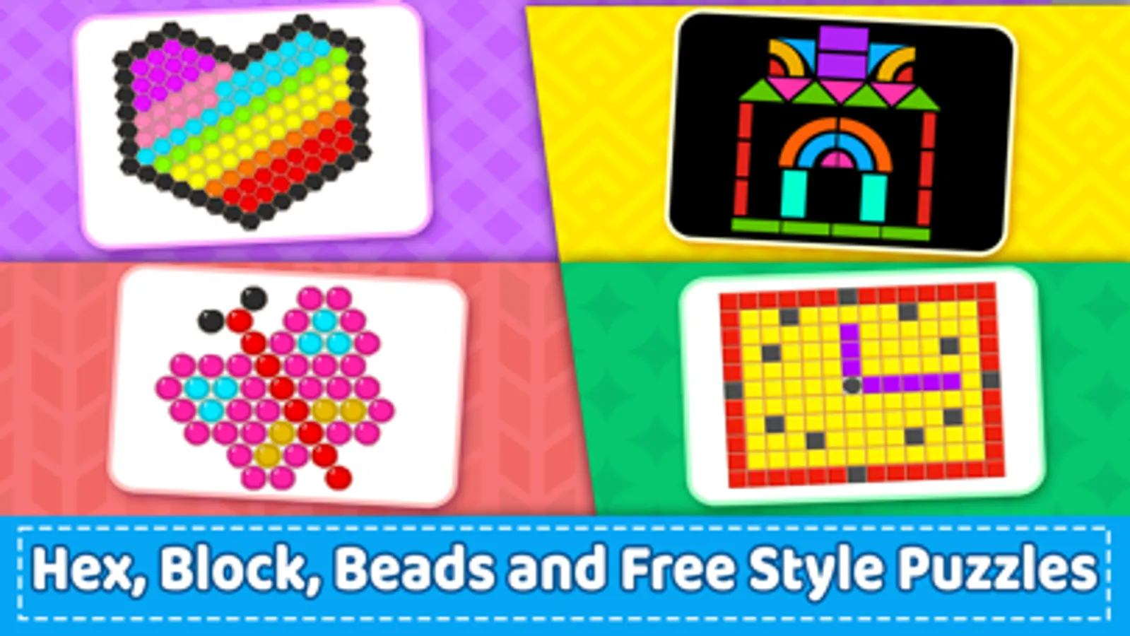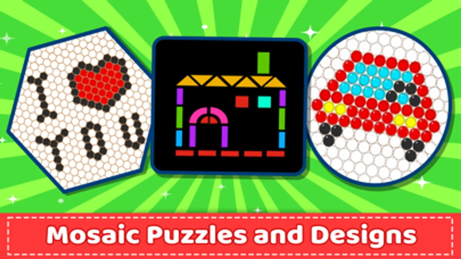 Mosaic Puzzles - Block, Beads & Hexa Puzzle isn’t just incredibly fun to play with fun activities for kids, it can also help children develop better hand eye coordination, ability to focus, recognition of colors and patterns & enhance creativity and imagination. This visual perception game for kids also helps them practice drawing and coloring skills along with pattern designing.