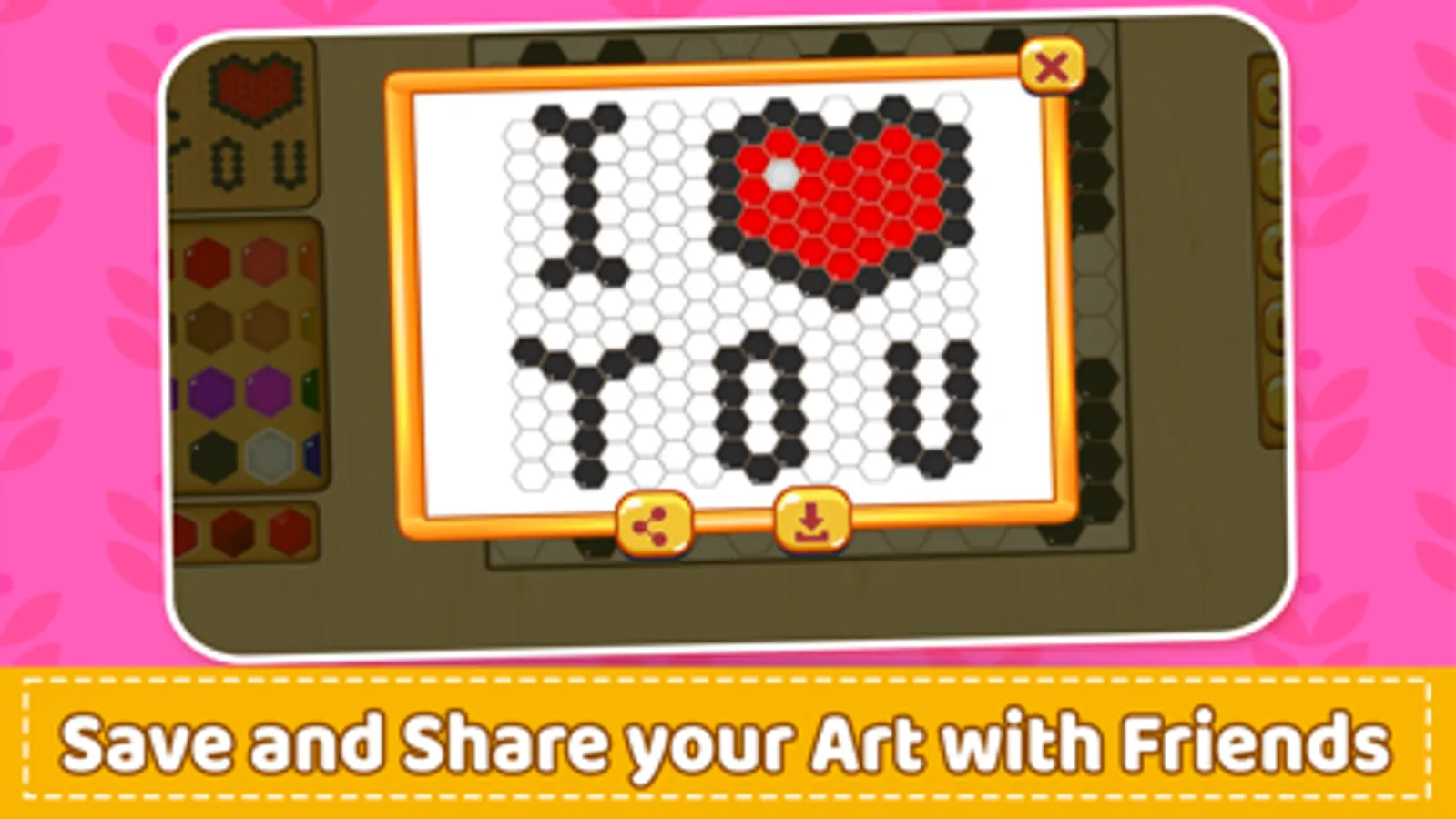 Each beautiful hexagon art you recreate can be turned into pic. Recreate these hex arts in a fun mosaic hexagon puzzle with stunning graphics, ultra-vivid colors, fun and upbeat music! This mosaic game is a color puzzle game for kids, pixel art fun game for families to apply imagination to create mosaic face, mosaic effect patterns and pictures for girls