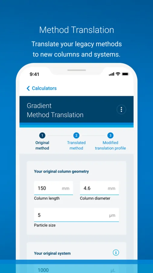This calculator helps you translate your legacy methods to new columns and systems. Simply enter the information from your legacy method (column, system, experimental conditions, and gradient) along with the new column and system that you are going to use. Then, the calculator determines the experimental conditions and the gradient of your new translated method. For all fields in these calculators, you can either use default values or values that are specific to your method, column, and system. All results can be saved as a PDF.