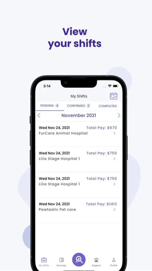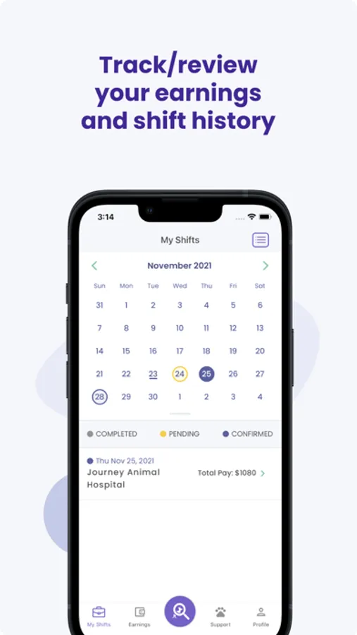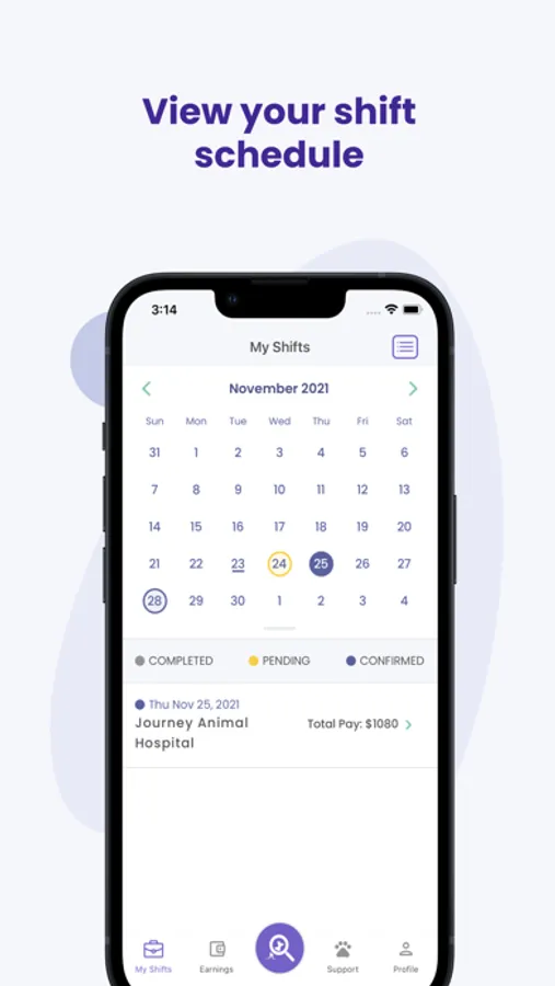 Manage/review your shifts — pending, confirmed and completed — either as a list or on a calendar.