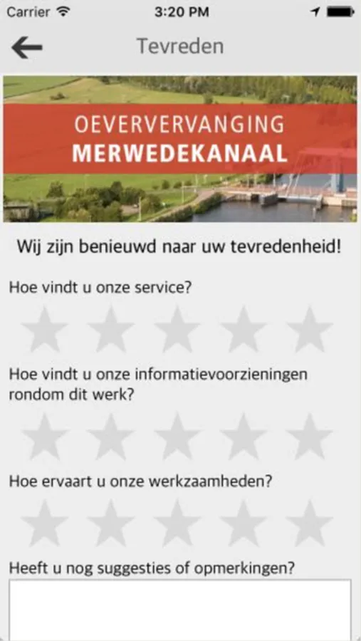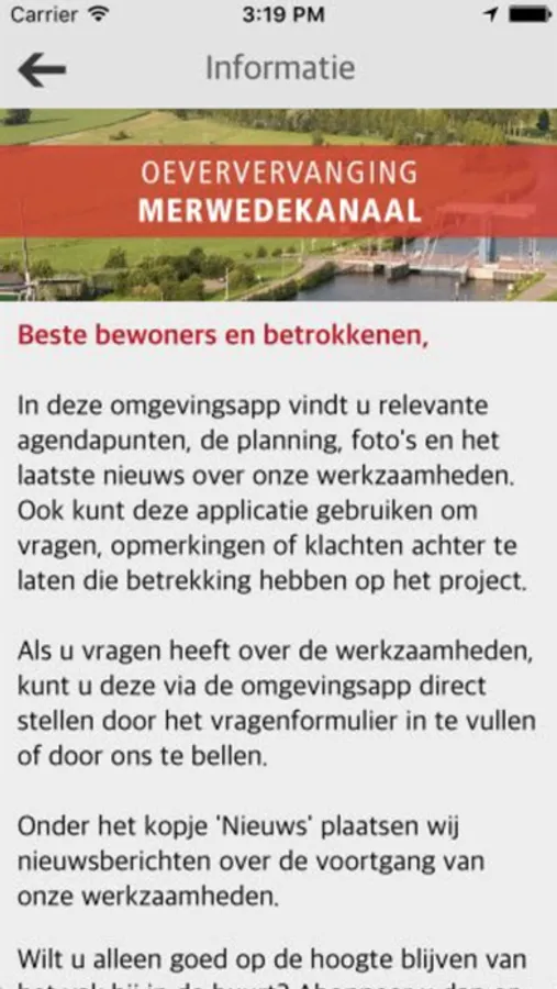In deze app vindt u alle informatie over de werkzaamheden van het project Oeververvanging Merwedekanaal. Er worden relevante agenda puntjes, de laatste planning en contactinformatie weergegeven . Ook kunt u op deze app vragen, opmerkingen of klachten achterlaten die betrekking hebben op het project.