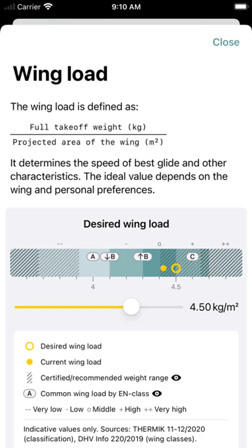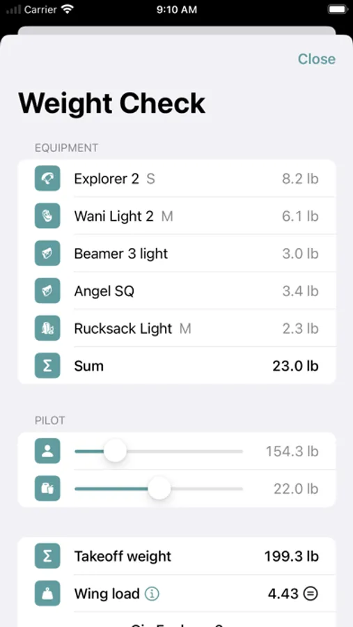 To optimize performance and safety, the app automatically calculates whether the paraglider & rescue are within the weight range and helps you choose a good wing loading.