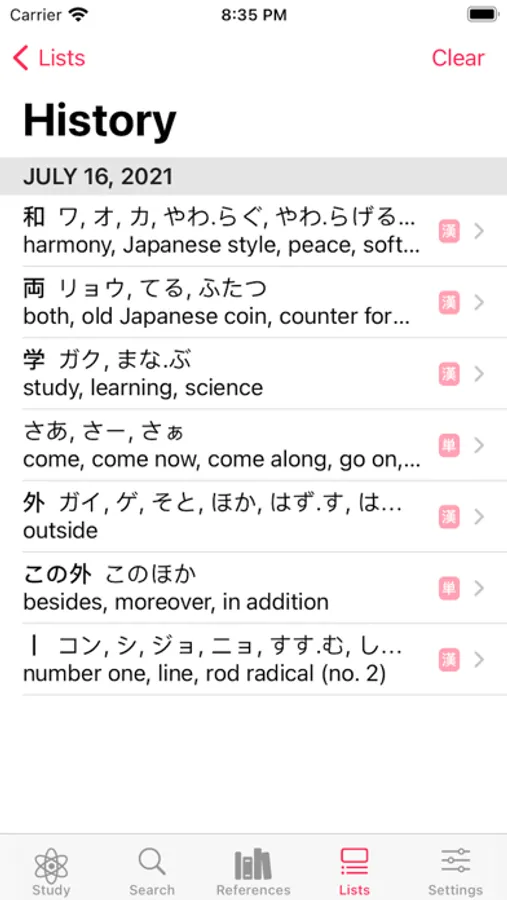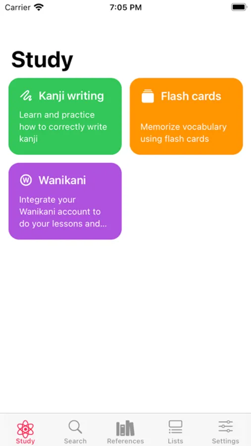 * Flash cards: Create & Study flash cards from radicals, kanji, vocabulary, or grammar.