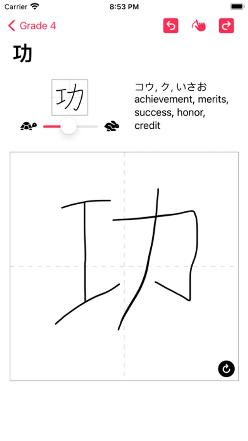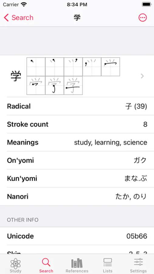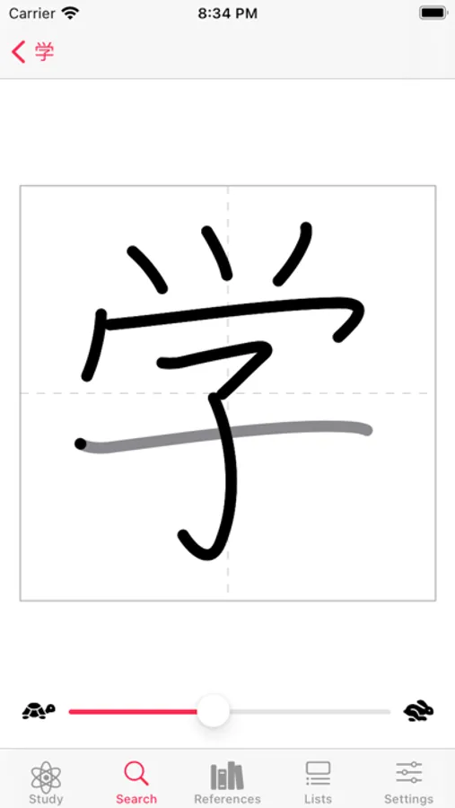 * Kanji writing: Learn how to write any Kanji correctly. Provides a guided animation, so you never have to feel intimidated by a complex-looking Kanji character