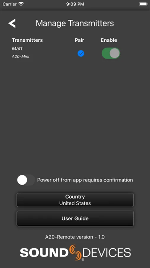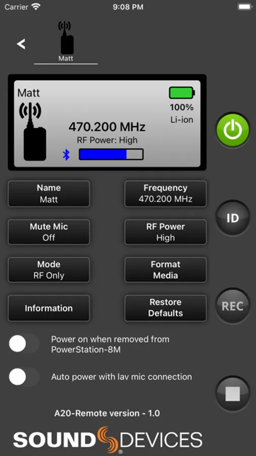When connected via Bluetooth LE to the Sound Devices A20-Mini or A20-TX, A20-Remote offers control and display of the transmitter parameters, including: