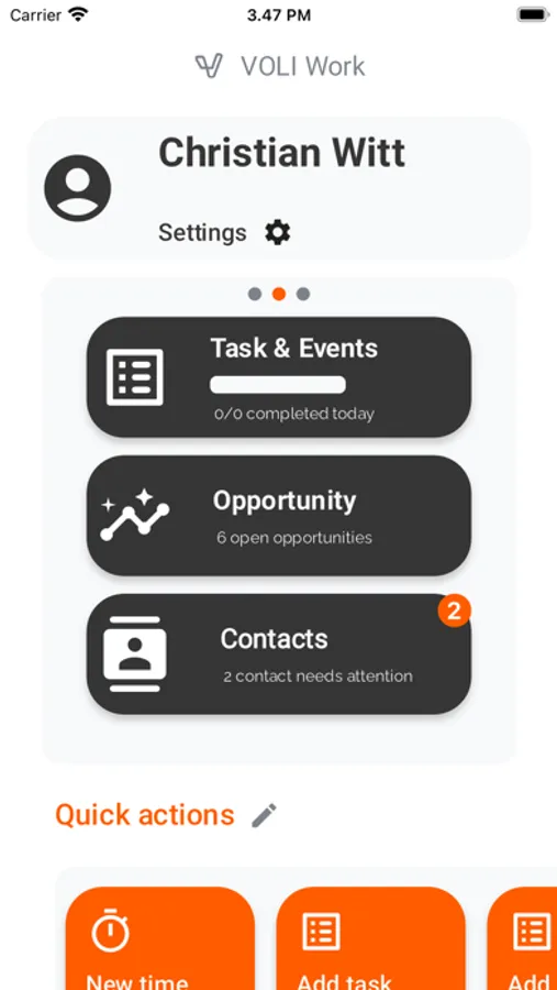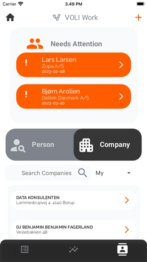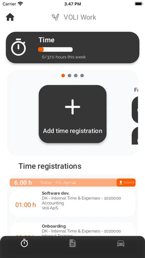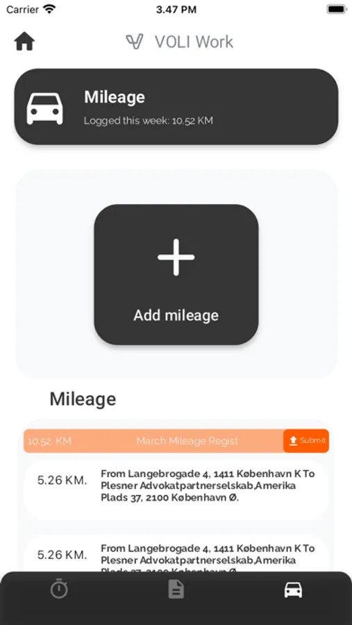You can either choose to log past time spend on a client, or you can simply press start and let VOLI work do the tracking. To track your time, simply start the timer when you begin an assignment or meeting and press stop when you are done. The registration is logged as an entry and you can add the job number and task, attaching the time to the concerning client. The entry is mirrored to Maconomy.