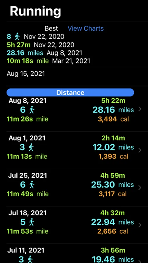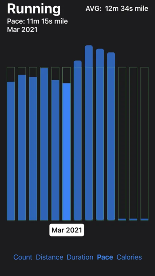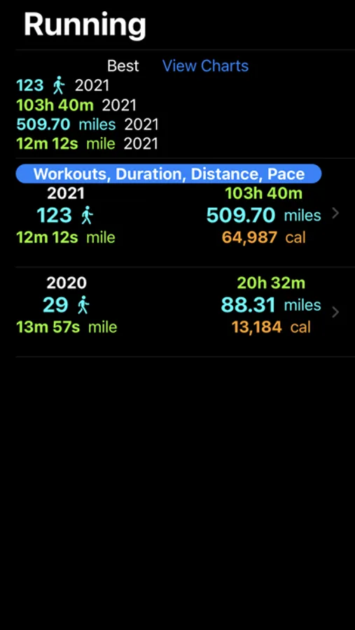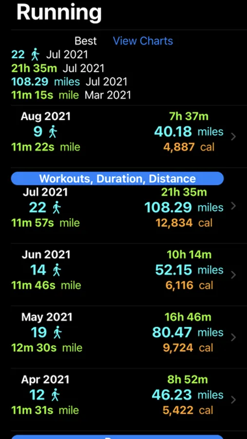 The easiest and quickest way to see and compare workout stats grouped by Year, Month, Week, or Day!