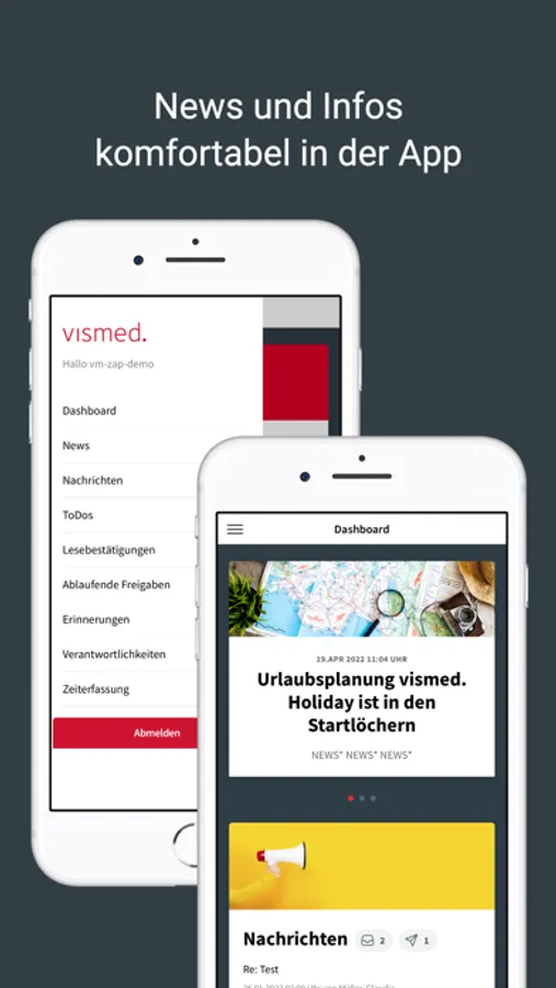 Wir sehen unseren QM Messenger als eine kleine Hilfe für alle die sich um das QM im Unternehmen kümmern müssen. Genau das macht unser QM Messenger. Sie können hier komfortabel unsere regelmäßigen News zu vismed. QM und unseren Software-Updates lesen. Ein wichtiger Bereich unserer neuen App ist die Funktion, dass Sie die von Ihnen durchgeführten Unterweisungen sehen können. Außerdem können Sie die an Sie zugewiesenen Lesebestätigungen lesen und bestätigen. Sehen Sie außerdem komfortabel eine Übersicht der Erinnerungen in vismed. QM und versenden Sie interne Nachrichten an Ihre Nutzer ohne ein zusätzliches eMail Programm bemühen zu müssen. Sie finden außerdem eine Übersicht der ablaufenden Freigaben und Verantwortlichkeiten. Für unsere Laborkunden haben wir außerdem die Kundenwünsche integriert.