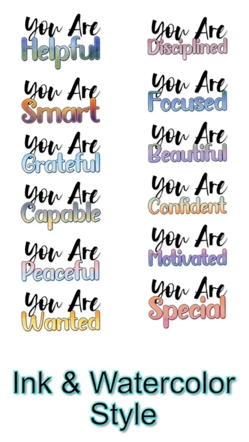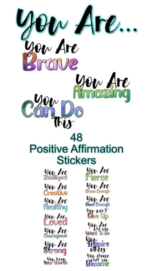 48 Colorful motivational stickers with positive affirmations to inspire yourself and other people. Bold ink and watercolor style. These stickers look great in light or dark mode!