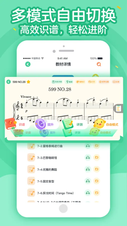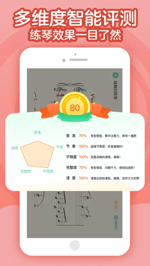 全曲测评模式,多维度分析打分,并提供练琴报告,练得好不好,效果一目了然,还可以同步日报周报,进步看得见!
