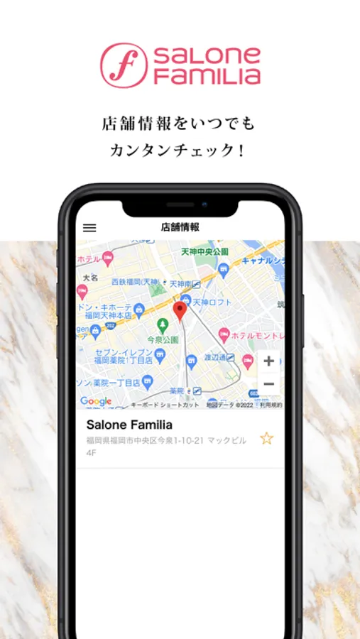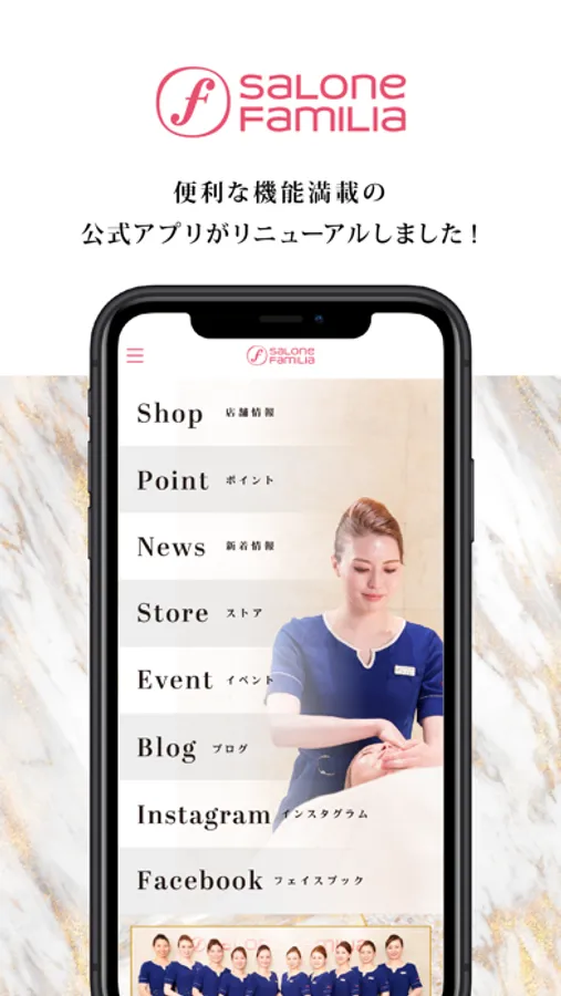 「Salone Familia」公式アプリをダウンロードすると、お店へのご連絡がスムーズにできるほか、様々なお知らせや、店休日の確認、会員証の管理などが簡単にしていただけます。