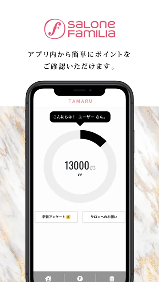 サローネファミリアではポイントシステムを取り入れております。アプリをダウンロードしていただくとお客様のポイント数をいつでもご確認いただけます。