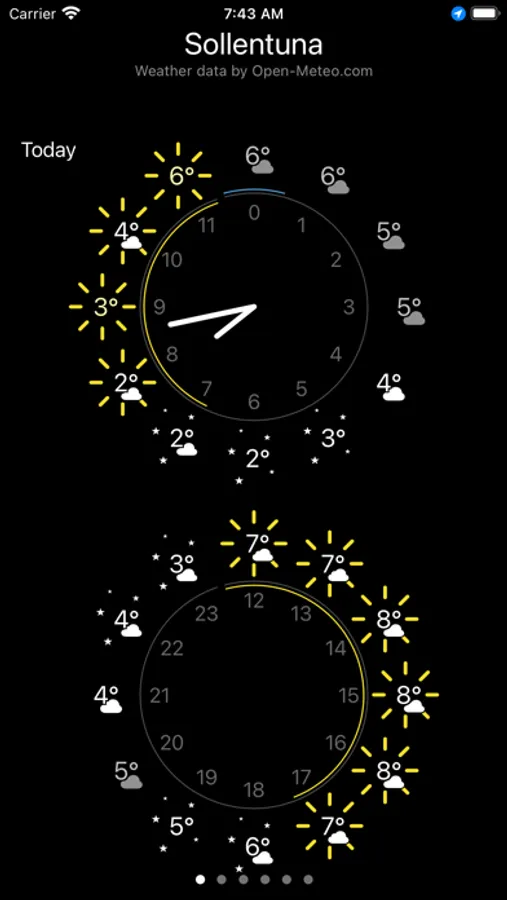 See the entire days weather with a glance. AM at the top, PM at the bottom. Yellow line is when the sun is up. Blue line is how much rain there is.