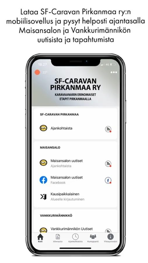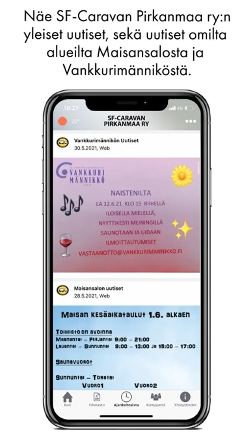 Sovelluksesta löydät SF-Caravan Pirkanmaa ry:n yleisten uutisten lisäksi omien alueiden Maisansalon ja Vankkurimännikön tuoreimmat uutiset.