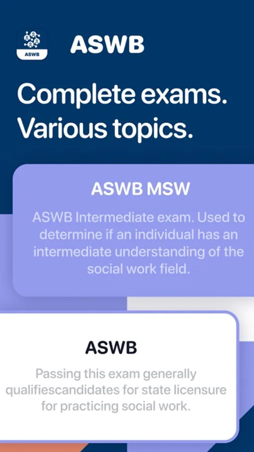ASWB is a nonprofit organization composed of the social work regulatory boards and colleges of all 50 states. ASWB maintains the social work licensing examinations that are used to test a social worker’s competence to practice ethically and safely. Our app is organized to closely follow the actual objectives for ASWB test. These ASWB practice tests contain questions from four main knowledge domains: