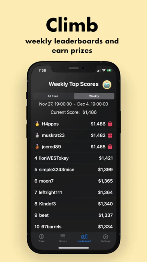 Daily and Weekly leaderboards help you measure performance in the Dogecoin market. Leaderboards help you refine your trading strategy to beat the market while having competitive fun!