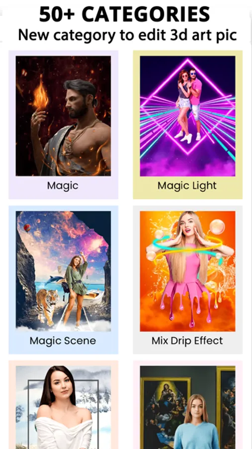 Aeroplane, Animal Safari, Artistic Way, Atlantis, Big Camera, Bridge of Love, Cartoon, Christmas, Cosmos Voyage, Dreamy Wings, Drip Art, Fashion Frame, Flaky Clouds, Geometric, Get Stuck, Glitch, Halloween, Happy New Year, Himachal Scenery, Invisible Me, Love, Magic, Magic Light, Magic Scene, Mix Drip Effect, Painting Frame, Photo Gallery, Picnic, Plastic Effect, Play With Gravity, Pop Art, Portal, Poster, Rainbow, Rickshaw, Shooter Scooter, Sky View, Smoke Art, Sparkling, Spinning World, Spiral, Stamps, Steam, Super Car, Train Journey, Tropical, True Love, Under World, Upside Down, Water Color, Wild Call, World Winter.
