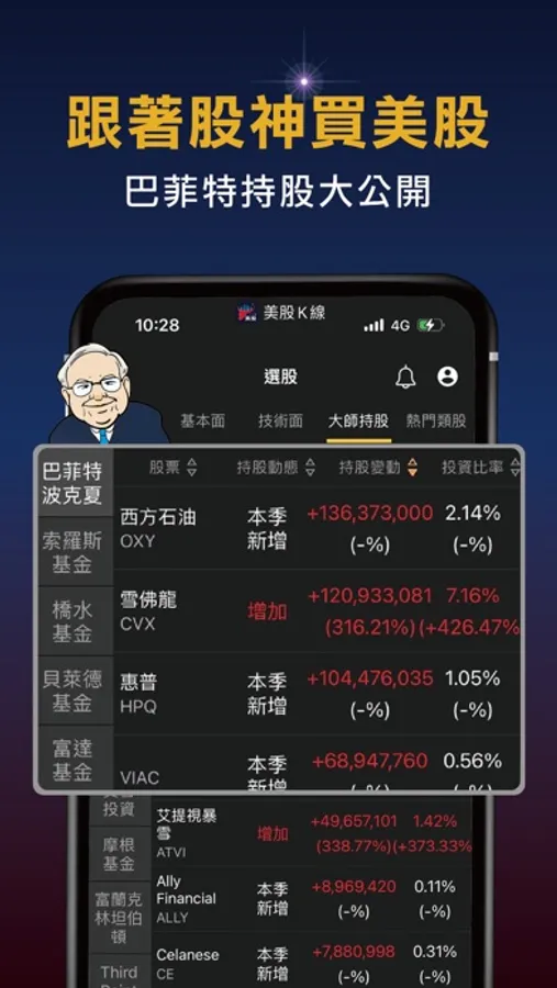 美股眾多標的不知道該如何選擇嗎? 選股頁面一次幫你全整理! 讓您不用自己花時間去找尋新標的! 除了依照市值、營收排序的熱門排行榜,還能看到投資大師們的持股,想知道股神巴菲特究竟投資了哪些股票嗎? 快來美股K線選股頁挖寶吧!!