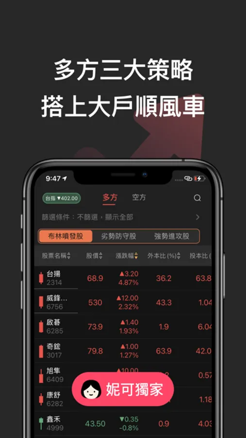當大盤維持上漲趨勢時,可利用籌碼分布和布林通道,選出強勢噴發的股票。找出飆股的起漲點,賺取波段的上漲,適合積極型的投資人。