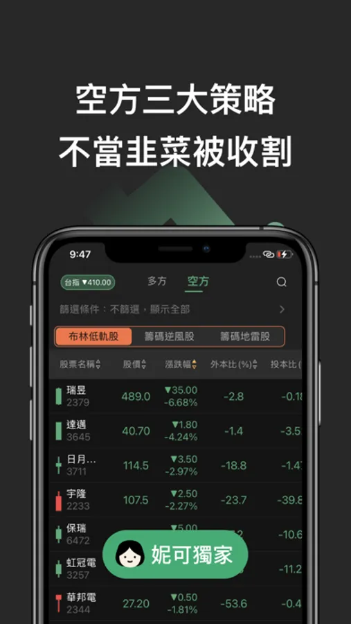 當大盤位於下跌趨勢時,可利用籌碼、成交量和股價,避開主力不買、股價相對弱勢的股票。減少買到下跌股和地雷股的風險,或是反向做空。