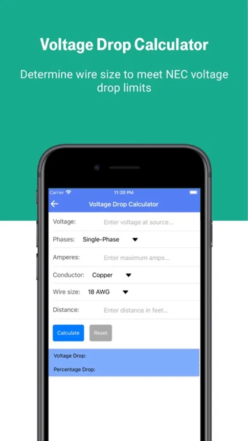 - Voltage drop calculator: determines wire size to meet NEC voltage drop limits or calculates voltage drop for a specific run.
