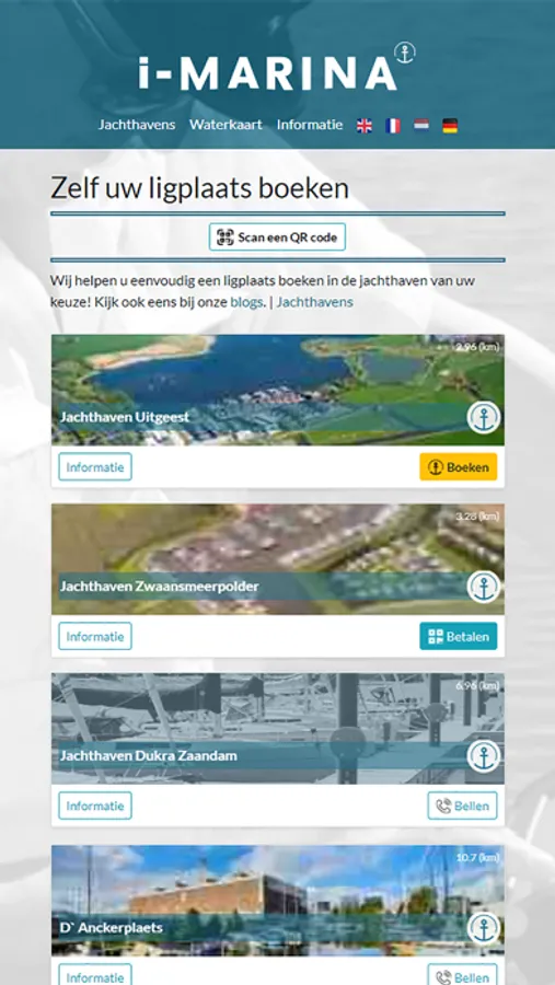 In deze app en op i-Marina.eu vindt u alle informatie over jachthavens die gebruik maken van i-Marina en kunt u bij een groot aantal van deze havens direct uw ligplaats boeken en betalen via de app en/of via de website.
