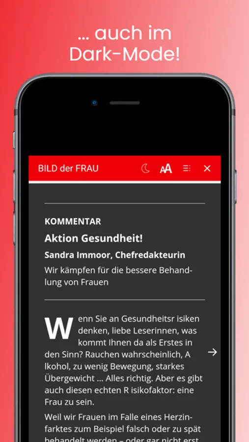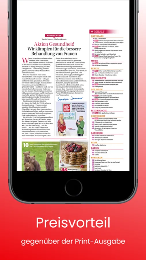 BILD der FRAU ist die vielseitig informierende und unterhaltende Zeitschrift für Frauen, die ihr Leben selbst in die Hand nehmen. Sie behandelt das Spektrum des Lebens klar, klug, kompetent – immer mit Herz! BILD der FRAU entspannt und unterhält mit exklusiven Interviews und Reportagen, berät in allen Lebenslagen und hält Tipps und Tricks für den Alltag bereit. Ebenso können Sie sich von leckeren Rezepten oder den neusten Mode- und Beautytrends inspirieren lassen.