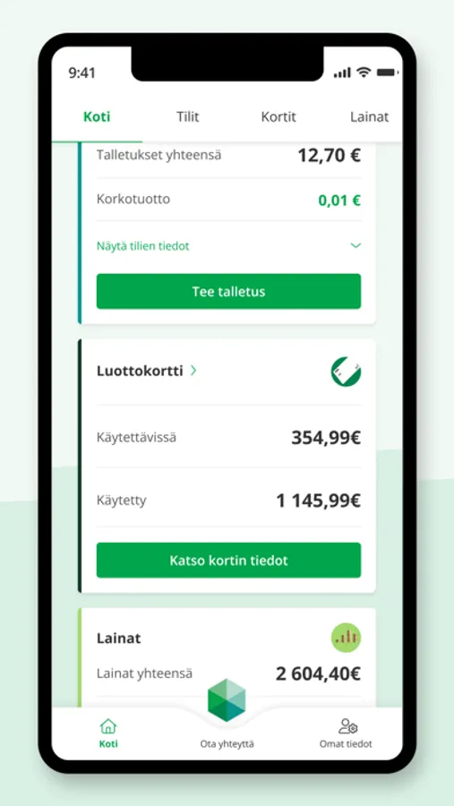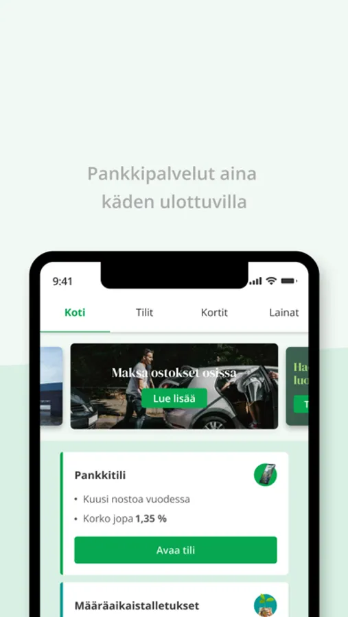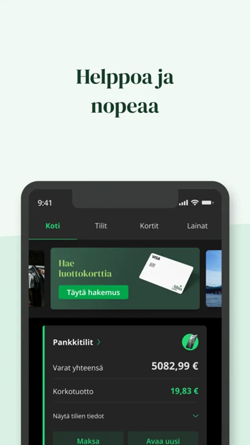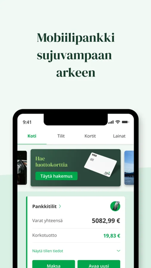 Mobiilipankki on paras tapa pankkiasiointiin. Voit hoitaa asioitasi juuri silloin, kun se sinulle parhaiten sopii. Tee talletus tai hae ja hallinnoi lainaa helposti ja nopeasti.