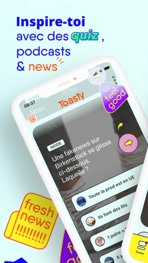 En plus des ventes, Toasty ce sont aussi des quiz quotidiens pour vous faire réfléchir autour de la consommation responsable et améliorer vos connaissances en s’amusant. Chaque jour, nous vous posons 3 à 5 questions, chaque bonne réponse vous fait gagner des points convertibles en avantages exclusifs (cadeaux, réductions).