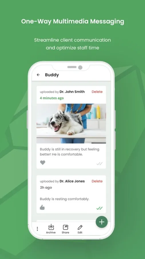 Gemma's unique one-way multimedia messaging feature lets veterinary staff share their patients’ health progress with owners and post updates on their feed. The feature allows practice teams to focus on patient care by communicating with clients more efficiently.