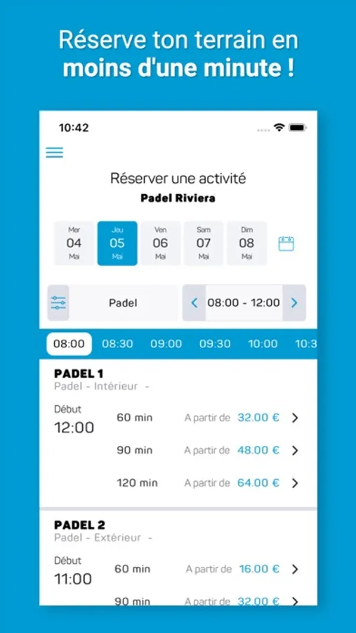 Fini la corvée de réservation ! Avec l'application tu n'as plus qu'à accéder aux créneaux disponibles et à en choisir un. Le club recevra alors automatiquement ta réservation.