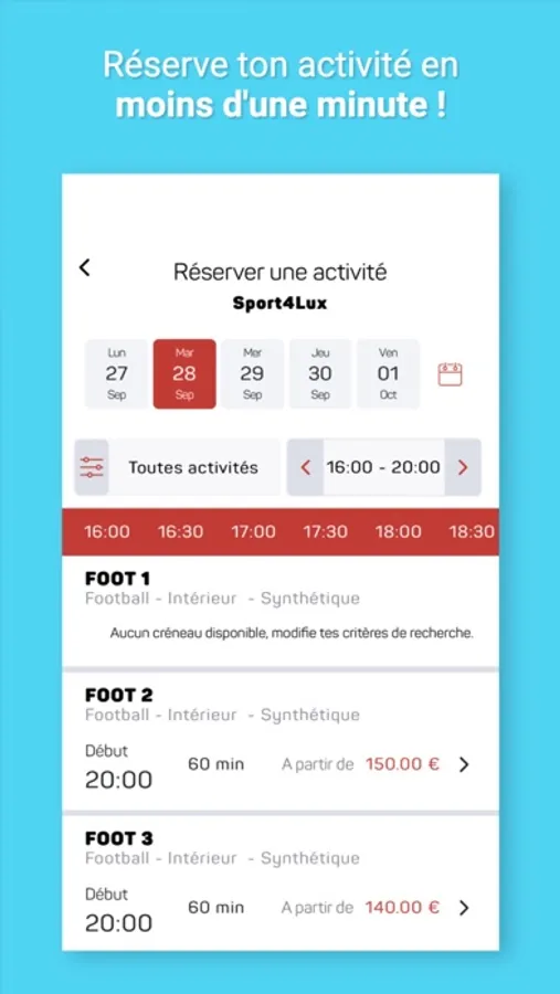 Fini la corvée de réservation ! Avec l'application tu n'as plus qu'à accéder aux créneaux disponibles et à en choisir un. Le club recevra alors automatiquement ta réservation.