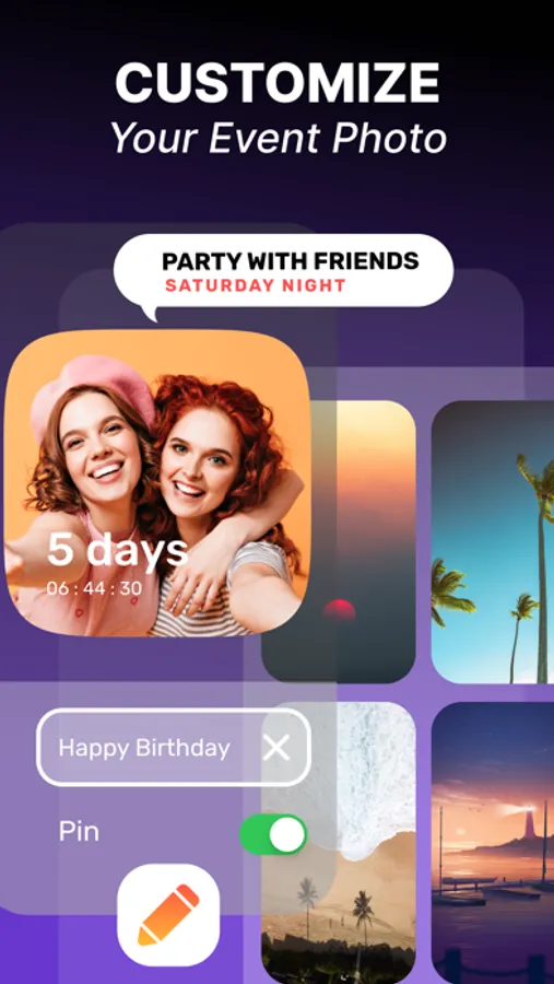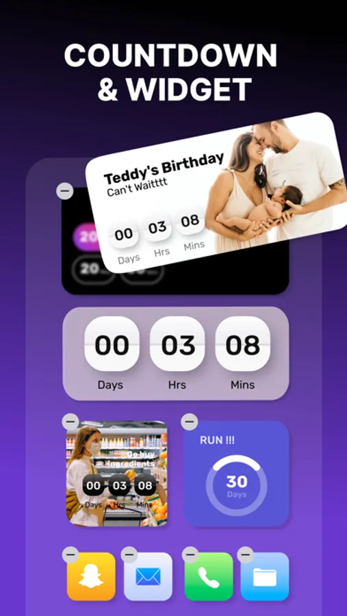 Create a countdown widget on your home screen with your own way design. Be able to count the most important days end events every day right in front of you.