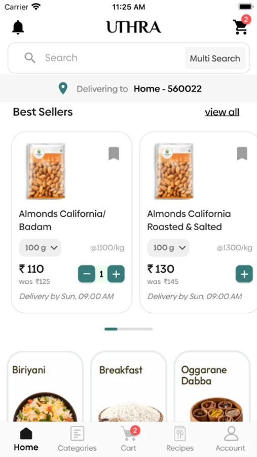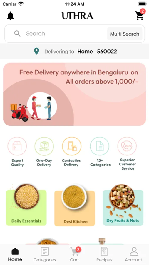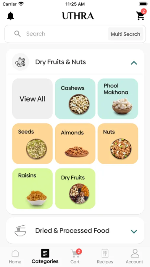 With Uthra, you can now indulge in the supremacy of taste and flavor of our national produce with no compromise in quality. Our wide selection of groceries essential for daily use - from handpicked Pulses & Grains, freshly ground Spices, several varieties of Rice, freshly ground Flours, Exotic Fruits and Vegetables, Cold-Pressed Oils, Dried & Processed Food to Premium Nuts and Dry Fruits, sample the bounty that Mother India has to offer with Uthra. Nourish your family with meals prepared with the highest quality goods that meet the highest international food standards.